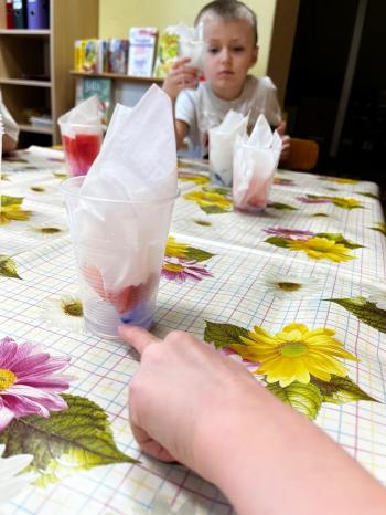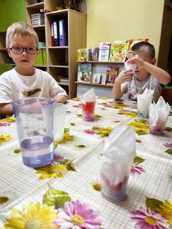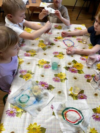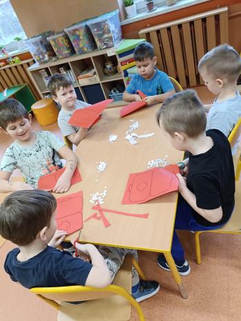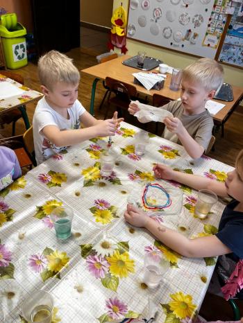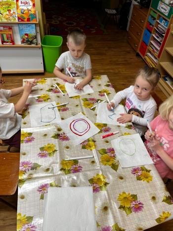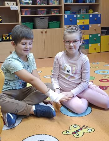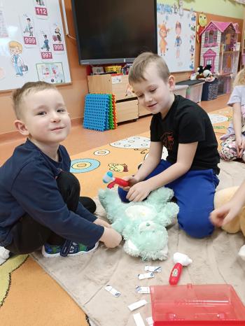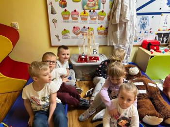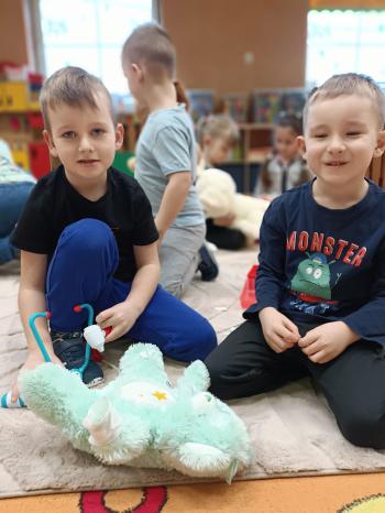 Grupa „Słoneczek” Podczas zajęć plastycznych najmłodsze przedszkolaki przeniosły się do pasjonującego świata medycyny, gdzie ich głównymi bohaterami był chory miś i lalka. „Słoneczka” z zapałem wykonywały prace plastyczne, nadając im kolorowe i radosne oblicze. Każde dziecko miało okazję wykazać się kreatywnością, co sprawiło, że mały pacjent ,,Miś” wyglądał naprawdę wyjątkowo! Dzieci wcieliły się również w rolę małych lekarzy, bawiąc się w diagnostykę. Poprzez zabawę utrwalały podstawowe umiejętności udzielania pierwszej pomocy. Zajęcia były pełne śmiechu i radości, ich celem było wzmocnienie postawy odpowiedzialności i gotowości do udzielenia pomocy potrzebującym. To była nie tylko artystyczna przygoda, ale także ekscytująca nauka. Grupa „Kaczuszek” „Kaczuszki” tego dnia brały udział w zabawach matematycznych rozwijających kompetencje poznawcze takich jak: -"Zagadki" - nauczyciel zadawał dzieciom zagadki związane z pracą lekarza, dzieci odgadywały, odszukiwały obrazek, wieszały go na tablicy. -"Miś uczy się liczyć" - nauczyciel podaje nazwę jednego z różnych przedmiotów związanych z pracą lekarza, dzieci próbowały wskazać je na planszy, przeliczyć, dopasować odpowiednią ilość oczek oraz cyfrę. -"Miś ma ospę" - Dzieci rzucały kostką, liczyły wyrzucone oczka na kostce, pokazywały na palcach ile kropek wyrzuciły, zadaniem dzieci było przykleić taką samą ilość czerwonych pomponów do chorego Misia. -"Pomóż Misiowi zwalczyć anemię" - Dzieci wraz z nauczycielem rozmawiały w kole o tym co oznacza dla nich zdrowie, jak o nie dbają. Przedszkolaki opowiadały o tym co lubią jeść, jak dbają o ząbki lub bawią się na powietrzu. Zastanawiały się nad tym jak można zadbać o zdrowie Misia aby zaczął się czuć dobrze każdego dnia. Dzieci wykonały przetaczanie krwinek czerwonych w celu zwalczenia anemii u Misia. Zachęciły go również do jedzenia większej ilości roślin strączkowych, szpinaku i rukoli w celu uzupełnienia niedoboru żelaza. -"Z wizytą u lekarza" - przedszkolaki przyjęły kolejnego pacjenta który uległ wypadkowi w czasie jazdy na rowerze. Wykonały zdjęcie rtg łapki. Zszyły ranę skóry. Opatrzyły rękę. Każdy z pacjentów został przebadany i pozostawiony w szpitalu na obserwacji. Na zakończenie zajęć dzieci wykonały eksperyment z wodą i chusteczką. W małym szpitalnym laboratorium dzieci obserwowały jak zachowa się chusteczka higieniczna zanurzona w kubeczku z wodą na której wcześniej przedszkolaki namalowały dwa kolorowe koła. Chusteczkami o różnych wzorach i barwach ozdobiły kolorowankę.