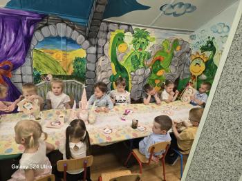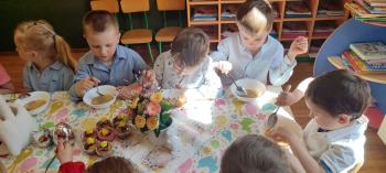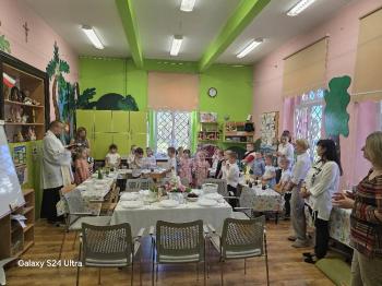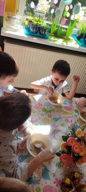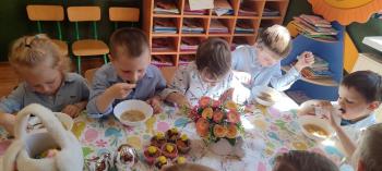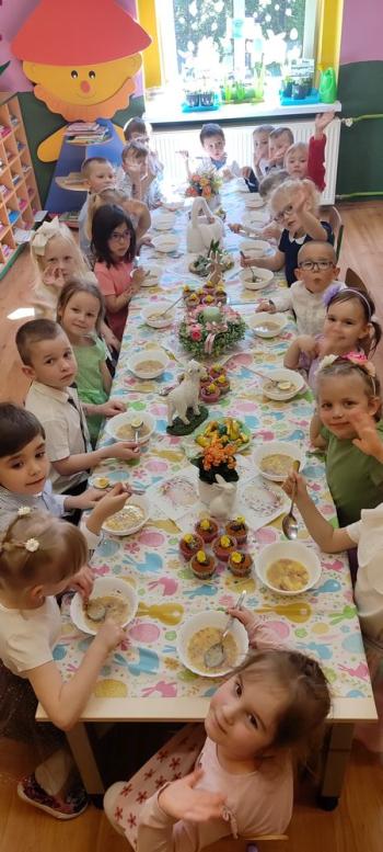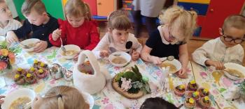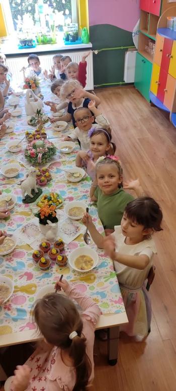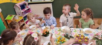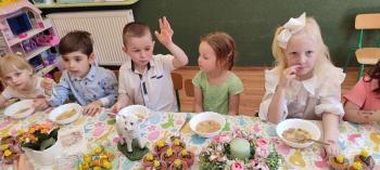 W piątek, 14 kwietnia, w naszym przedszkolu odbył się tradycyjny Obiad Wielkanocny, które wprowadziło nas w świąteczny nastrój i pozwoliło wspólnie celebrować ten wyjątkowy czas. W pięknie udekorowanych salach dzieci zasiadły do wspólnego stołu, na którym nie zabrakło świątecznych przysmaków – jajek, białej kiełbasy, żurku i słodkich wypieków. Każda grupa miała okazję złożyć sobie życzenia, a także porozmawiać o wielkanocnych tradycjach i symbolach, takich jak pisanki, baranek czy palma. To wyjątkowe spotkanie było nie tylko okazją do wspólnego świętowania, ale również do nauki – dzieci uczyły się, jak ważna jest wspólnota, dzielenie się i okazywanie sobie życzliwości.