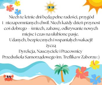 przed Wami długo wyczekiwane wakacje – czas pełen słońca, przygód i beztroskiej zabawy! Życzymy Wam, aby każdy dzień wakacyjnych chwil przynosił uśmiech, radość i niezapomniane wspomnienia. Niech to będzie czas pełen: słonecznych dni, kolorowych przygód, odkrywania świata i spędzania czasu z najbliższymi! Wracajcie do nas wypoczęci, pełni energii i gotowi na nowe przedszkolne (i szkolne!) wyzwania.
