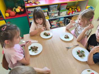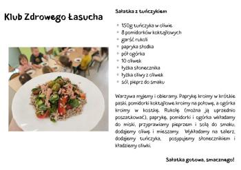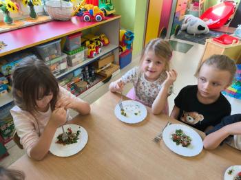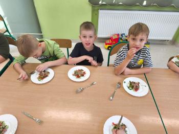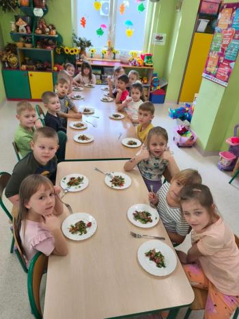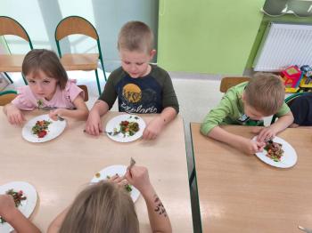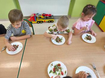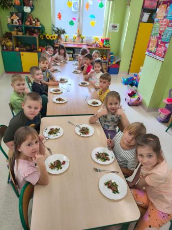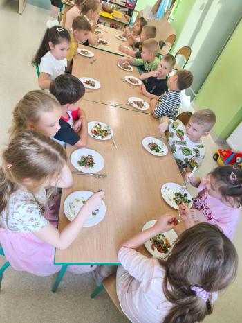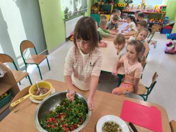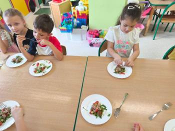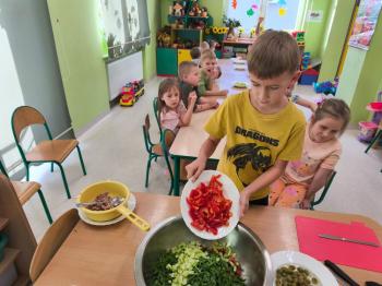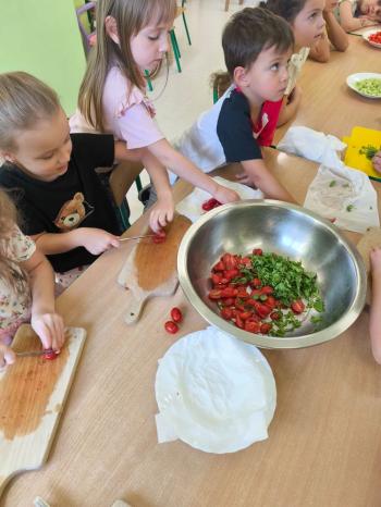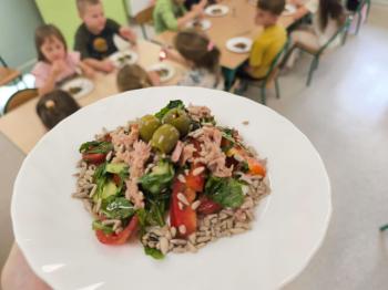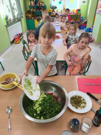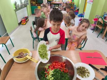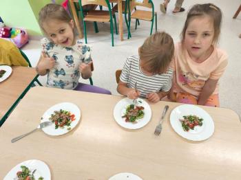 Podczas pierwszych zajęć Pszczółki zrobiły sałatkę z rukolą i tuńczykiem, w której każdy mógł znaleźć coś dla siebie. Nieważne czy ktoś zjadł tylko oliwki, pomidorki, tuńczyka czy nasiona słonecznika. Ważne, że dzieci z ochotą postanowiły spróbować samodzielnie wykonanej sałatki. Pierwsze cele osiągnięte.