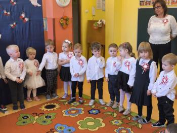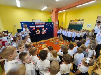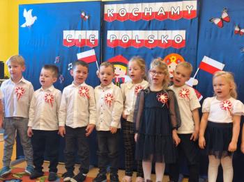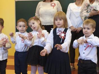 W piątek 7 listopada, jak każdego roku nasze przedszkole dołączyło do akcji „Szkoła do hymnu.” Z okazji zbliżającego się Święta Niepodległości, wszystkie dzieci zebrały się w jednej sali, aby o symbolicznej godzinie 11:11 uroczyście odśpiewać hymn narodowy. Następnie, każda grupa wykonała przygotowane krótkie programy artystyczne, które dawały wyraz pięknej patriotycznej postawy przedszkolaków i potrafiły wzruszyć do łez.