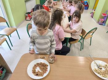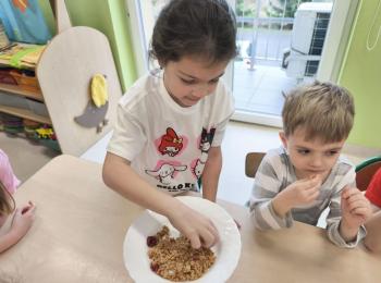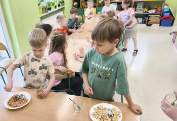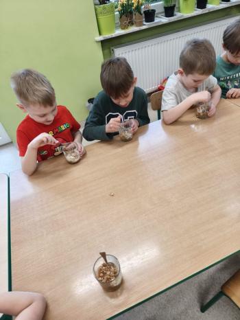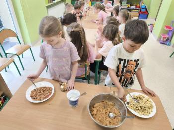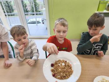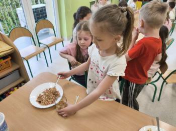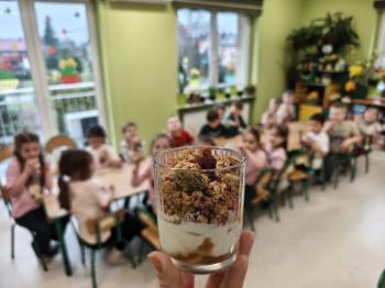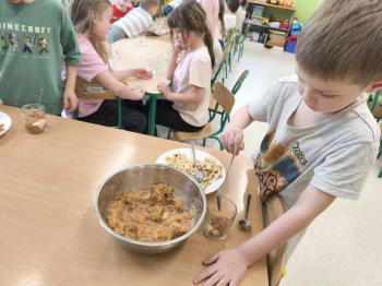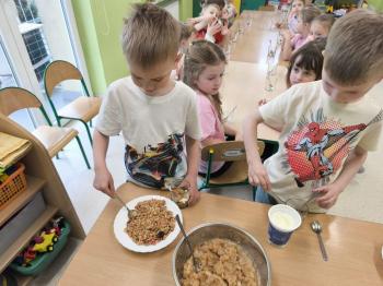 Marcowe zajęcia podczas realizacji innowacji pedagogicznej „Klub Zdrowego Łasucha” w grupie Pszczółek, zachęciły nas do degustacji granoli z owocami. Ten szybki w wykonaniu deser, spośród wszystkich dotychczas przygotowanych przez Pszczółki posiłków, stanowczo najbardziej zadowolił wymagające podniebienia naszych najstarszych przedszkolaków. Po przygotowaniu wszystkich niezbędnych składników, dzieci samodzielnie nakładały kolejne warstwy deseru, by cieszyć się orzeźwiającym smakiem połączenia jogurtu z musem jabłkowym, kawałkami banana i granoli.