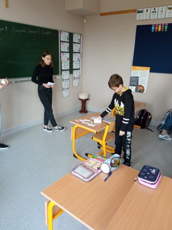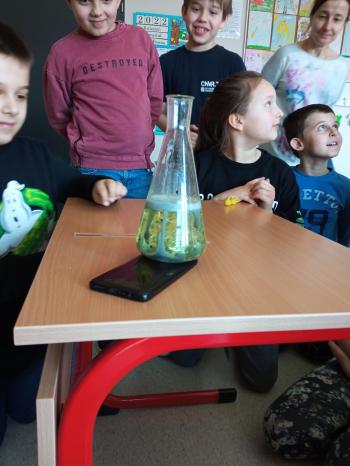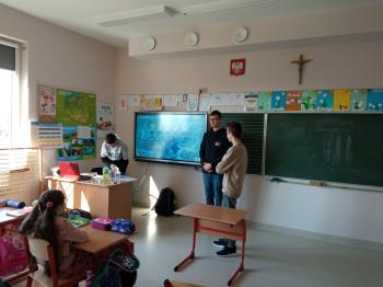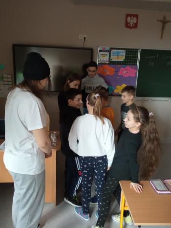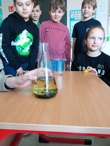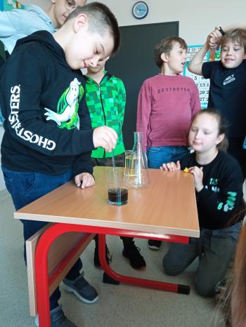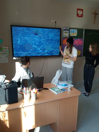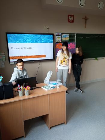 Uczniowie klas młodszych wzięli udział w zorganizownych przez starszych kolegów, specjalnie przygotowanych lekcjach. Klasa 8b zorganizowała w oparciu o materiały PAH zajęcia o wodzie. Były prezentacje multimedialne, filmiki edukacyjne, a także doświadczenia pokazujące właściowości wody.